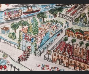 2015. “La città e tutti i suoi luoghi si svegliano all’alba. Ogni spazio è pronto a far apprendere e in ogni angolo ci sono maestri e allievi in simultanea (la scuola e la bottega) e in differita (la storia e la cultura). Attraverso la “porta” dell’edificio comune che non ha aule nè luoghi chiusi per studiare ma solo un auditorium, una biblioteca,i servizi, arrivano e partono gruppi di bimbi da diverse direzioni accompagnati e non. Sanno dove andare. Il piccolo bus elettrico lascia un gruppetto al museo dove trascorrerà la giornata a visitare, a parlare di storia ad imparare facendo nei laboratori annessi. Un altro gruppetto, a piedi, con i suoi maestri raggiunge la mediateca per effettuare ricerche di matematica, storia, scienze sui libri, sulle riviste, in rete. Lo stesso tragitto è già scuola e se ne parla con i maestri. Ogni ambito li accoglie con uno spazio collettivo dove c’è l’occorrente per sedere, condividere, leggere, scrivere, lavorare. La mobilità è la chiave di questo modo nuovo di concepire la scuola e i suoi luoghi. Ci si muove a piedi, in bicicletta, con bus elettrici, con la metro. Ci si muove verso le aule reali sparse[…]”