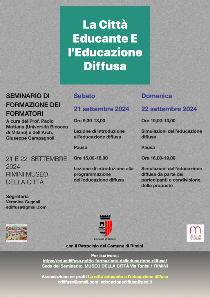 “In ogni città esiste un patrimonio enorme non utilizzato di saperi ed esperienze da mettere in comune con bambini e bambine, ragazzi e ragazze. È quello di tante botteghe e laboratori, musei e piccole gallerie, teatri tradizionali o di piazza, luoghi di musica e arte, biblioteche e librerie… L’educazione diffusa può aiutare a ripensare l’idea di apprendimento, favorire la partecipazione di cittadini al bene comune, ma anche fermare l’espulsione dei cittadini dai centri storici. “Gli educatori, i politici liberi e gli architetti illuminati dovrebbero solidalmente avviare questo percorso partendo magari da piccole realtà ed esperienze per estendere l’idea alle grandi città e alle aree metropolitane…”