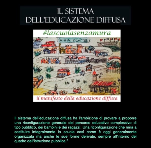 Nella fase di transizione verso un sistema dell’educazione diffusa occorre aprire le scuole verso un esterno che non è solo fisico e soltanto in natura ma può essere anche la periferia, può essere una piazza, un porticato, un cortile, una bottega, un teatro, può essere, in definitiva, il contatto con tutta la vita, che va dai laboratori, alle aule ai centri sociali, a qualsiasi tipo di attività della città che sia utile e anche educativa.